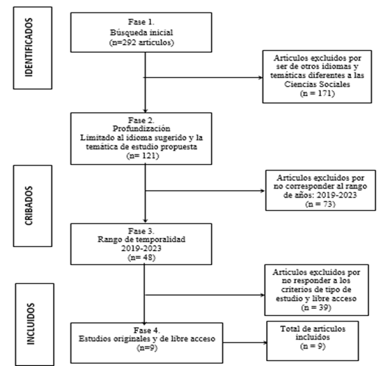 Los resultados se muestran atendiendo a las fases de indagación de los artículos relacionados con el hábito lector. La búsqueda fue realizada en el mes de septiembre del año 2023, en cuatro fases de análisis explicadas a continuación.