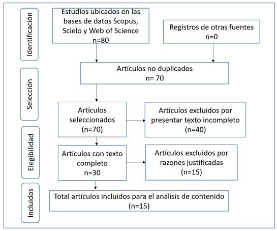 Tal como lo muestra la figura 1, al inicio, se ubicaron 80 estudios, de los cuales 70 resultaron no duplicados, 40 no presentaron texto completo y 15 fueron excluidos por razones justificadas, lo que dio como resultado un total de 15 estudios seleccionados.