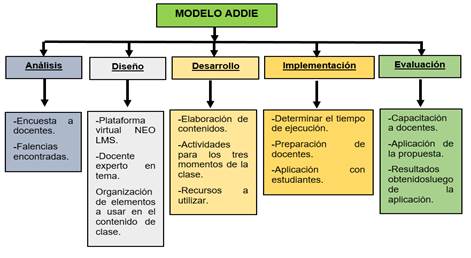 En lo que corresponde a la metodología a ser aplicada en el presente estudio, este corresponde a la metodología ADDIE (Análisis, Diseño, Desarrollo, Implementación y Evaluación) consiste en elaborar un esquema de trabajo del curso que se va a desarrollar y es válido para cualquier contexto educativo sea o no utilizado en las tecnologías de la comunicación y la información. En este modelo no se sigue necesariamente una secuencia lineal en sus fases ya que se pueden interrelacionar, las cuales son: