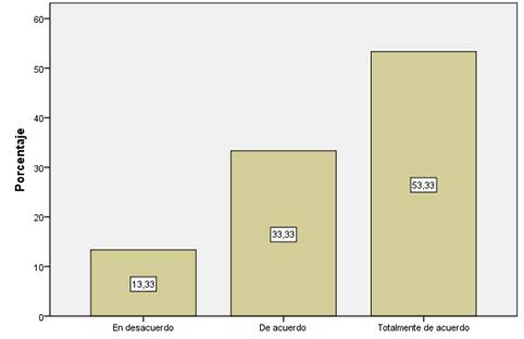 En la tabla 2 que se relaciona con el formato de contingencia, se puede denotar que de un universo de 15 docentes encuestados, 9 indican que se encuentran de acuerdo, 4 expresan el estar totalmente de acuerdo en dinamizar la interacción virtual considerando al WIX cómo una alternativa para que el docente logre implementar este proceso innovador para la institución educativa; al contrario, 2 educadores eligen estar en desacuerdo e indiferentes a cualquier proceso de capacitación que se encuentre dirigido al personal docente. Se puede interpretar claramente que la mayoría consideran la capacitación para el uso de recursos nuevos. Por tanto, es importante destacar de manera integral el apoyo de la mayoría de encuestados al plantear el objetivo principal de la necesidad de capacitación continua y el uso de Objetos Virtuales de Aprendizaje, como parte del proceso innovador que se encuentra acorde a los requerimientos de la sociedad tecnológica de hoy en día para lograr mantener el interés de los estudiantes por las diversas asignaturas que se estudian en el nivel de Básica Superior.