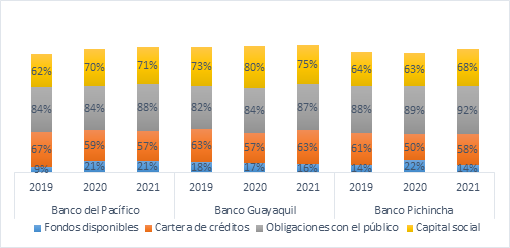 Analizando los estados financieros de los Bancos del Pacífico, Banco Guayaquil y Banco Pichincha, se observó que la cartera de crédito disminuyó del año 2019 al año 2020, denotando una afectación, directa de la pandemia. Por lo tanto, la falta de ingresos provocó que una mayor participación de los accionistas, situación que se refleja en el indicador de capital social sobre el total de patrimonio, dado que en las tres instituciones este aumentó.