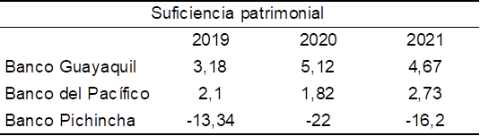 Indicador de capital: el Banco Guayaquil y el Banco del Pacífico tienen un indicador mayor a 1, esto significa que mantienen el capital suficiente para asumir resultados negativos, ya sea por un mal manejo administrativo o por riesgos financieros inesperados, como por ejemplo la pandemia del COVID-19. El Banco Pichincha presenta valores negativos, debido a que las cuentas que no generan interés no superan las provisiones y demás activos que si generan interés.
