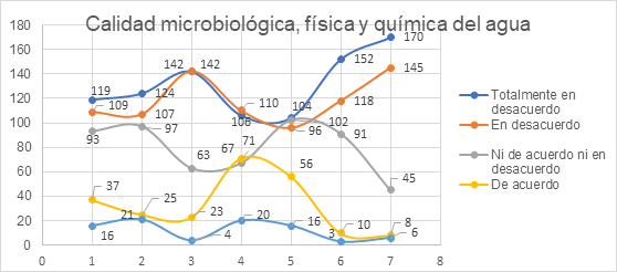 El estudio realizado por Campaña et al. (2017) sobre dos de los aspectos que afectan a la calidad del agua y causa de contaminación del agua, son la calidad microbiológica y química que actúan en cambios del aspecto físico, por lo que se puede afirmar que guarda correlación en el contexto Huaquillas - Ecuador que es de 0.431*; valor que se desprende al realizar la correlación entra las variables calidad del servicio de agua potable y calidad microbiológica, física y química expresada en la tabla 9 de la presente investigación. Por lo tanto, la calidad microbiológica, física y química tiene una relación directa con la calidad del servicio de agua potable; es decir, las variables estudiadas son directamente proporcionales.
