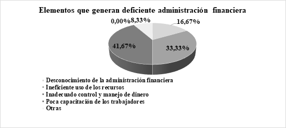 De igual forma la empresa debe de tomar en cuenta las respuestas de los encuestados en las alternativas como fueron: el inadecuado control y manejo del dinero con un 41,67%, el ineficiente uso de los recursos con un 33,33% por lo que estas dos respuestas de la pregunta le significan a la empresa que no tiene un buen manejo, control y seguimiento en los distintos procesos de la administración financiera, misma que puede generar inconvenientes en la toma de decisiones.
