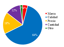 En el gráfico 2 se puede apreciar que para el 64% de los encuestados la calidad del producto ofertado es de suma importancia al momento de hacer la compra mientras que la cantidad y el precio son factores de menor incidencia con un 18 y 12% respectivamente, lo que nos permite inferir que la percepción del cliente frente a la calidad del producto eleva las posibilidades del cumplir con las expectativas que espera del mismo.