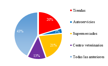 Como se indica en el gráfico 4, el 47% de los encuestados prefieren la presentación del producto en bolsas, un 31% se inclina por las cajas y la presentación con menor acogida es en baldes con 17%. En cuanto a la cantidad de producto que mejor se adapta a las necesidades del cliente en el gráfico 5 se puede observar que la cantidad de 5 kg tiene la mayor demanda con un 41% muy seguido de la cantidad de 10 kg con un 35%, la presentación del producto en cantidades de 2 kg representa un 14% mientras que para la cantidad de 25 kg o más de 25 kg se tiene un 6 y 4% respectivamente. Otro aspecto para considerar es la facilidad de acceso del consumidor hacia el producto, es decir los puntos de venta de preferencia para el cliente y de acuerdo con los resultados de la encuesta (ver gráfico 6) los establecimientos como tiendas, autoservicios, supermercados y centros veterinarios son ideales para adquirir el producto.