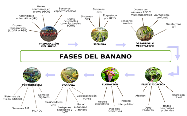 En la figura 2, se observa la aplicación de tecnologías AP asociadas en cada etapa del cultivo de banano, desde la preparación del suelo hasta la postcosecha.