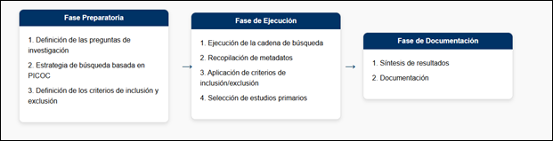 Para llevar a cabo el mapeo sistemático, se seleccionaron repositorios tales como Scopus, ScienceDirect, SAGE Journals e IEEE Xplore, repositorios que tienen una amplia relevancia y cobertura en literatura científica especializada. La investigación se guió mediante el marco PICOC (Población, Intervención, Comparación, Resultados y Contexto). En la Tabla 3 se definen claramente los elementos esenciales y construir cadenas de búsqueda robustas y precisas (Frandsen et al., 2020).