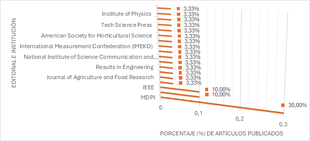 Desde una perspectiva geográfica, la concentración de publicaciones en países como Italia e India coincide con lo observado en revisiones previas (Bhor et al., 2024; Sharma et al., 2024), donde se destaca que estas regiones combinan una fuerte tradición agrícola con un desarrollo tecnológico emergente. En contraste, la limitada representación de países latinoamericanos y africanos, también identificada por Abu et al. (2022), sugiere que la brecha no radica en la aplicabilidad del IoT, sino en restricciones estructurales asociadas a infraestructura, financiamiento y políticas de innovación, lo que refuerza la necesidad de estrategias de transferencia tecnológica adaptadas a contextos en desarrollo.