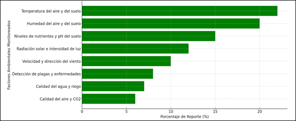La investigación confirma que la temperatura y la humedad del aire y del suelo, y los niveles de nutrientes, son los factores ambientales más monitoreados mediante IoT en la agricultura. Sin embargo, la baja adopción de sensores para monitorear CO2, calidad del aire y radiación solar indica una brecha en la investigación que podría limitar el impacto del IoT en la sostenibilidad agrícola.