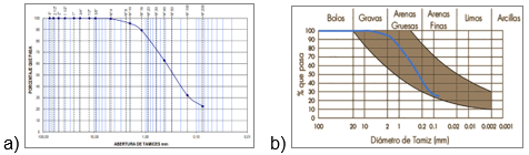 El análisis granulométrico mostró que el suelo cumple con los rangos de la norma UNE 41410: 2023, indicando una predominancia de partículas finas, con un 100 % de material pasando el tamiz N.º 4. La limitada presencia de fracciones gruesas y el contenido de finos sitúan al suelo con características intermedias entre arenas y limos. A continuación, la Figura 2 presenta (a) los resultados del ensayo y (b) la comparación con los rangos de la norma UNE 41410.
