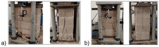 Para medir la resistencia a compresión axial de la mampostería construida con BTC se utilizaron ensayos en pilas, según la norma NEC-SE-MP, apartado 10.1. Se realizó el cálculo de la resistencia a compresión prismática según se especifica en la norma utilizada en el ensayo, y se determinó el módulo de elasticidad (E) tal como indican Turco et al. (2024). En la norma mexicana NMX-C-464 (ONNCCE, 2010), se presentan los modos de falla típicos en pilas de mampostería bajo carga axial, los cuales permiten comparar y analizar los resultados obtenidos en los ensayos.