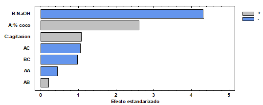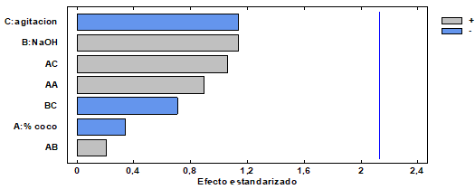 Como puede apreciarse, los efectos estadísticamente significativos corresponden a los factores (A), (B) y (C), así como la interacción (AB).También puede observarse que los efectos de (A), (AB) y (C) son positivos, es decir, incrementan el rendimiento de la reacción; mientras que el efecto de (B) es negativo, indicando que su aumento disminuye la variable de respuesta, esto puede atribuirse a que al estar más concentrada la solución de NaOH, las moléculas del álcali no se distribuyen en la mezcla de la misma forma que cuando la solución está más diluida, por lo que la interacción entre los reactivos para generar el producto se da en menor proporción.