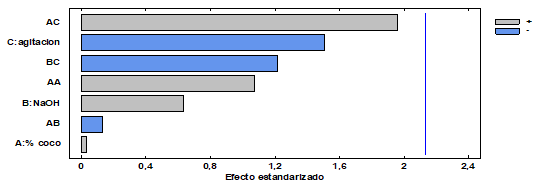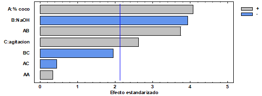 A continuación se presenta el comportamiento de las cuatro variables de respuesta, que permitieron determinar, mediante la construcción de modelos significativos, las mejores características de cada uno de los factores. La Figura 2, muestra el diagrama de Pareto para el pH, los efectos estimados se presentan en orden creciente de importancia. La línea vertical indica cuáles efectos son estadísticamente significativos, por lo que cualquier barra que se extienda más allá de esta línea corresponde a efectos que son estadísticamente significativos con un 95,0% de confianza. En este sentido, ninguno de los tres efectos ni las interacciones dobles resultaron ser significativos, lo cual denota que el aumento o disminución de los factores no cambia significativamente los valores en el pH, esto hace suponer que para los dos porcentajes de sosa, el álcali reaccionó en la misma proporción con los aceites, teniendo valores de pH similares.