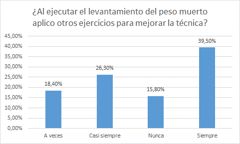 Cerca del 40% de los encuestados dijo practicar otros ejercicios (ajenos al powerlifting) para mejorar la técnica con la que ejecutan el peso muerto. Mientras que cerca del 16% de ellos afirmó nunca practicar otros ejercicios.