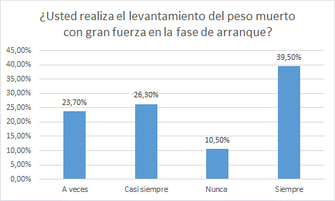 Con respecto a la fuerza en la fase de arranque para el levantamiento del peso muerto, el 39% de las y los encuestados afirman que sí, efectivamente imprimen gran fuerza en la fase de arranque en el levantamiento del peso muerto, mientras que el 10% de las y los encuestados no hacen necesario imprimir mucha fuerza en la realización del levantamiento del peso muerto.