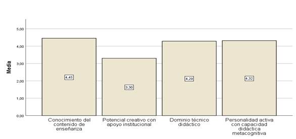 En cuanto al instrumento utilizado en base a las percepciones referente a la moda de las cuatro dimensiones, se ha encontrado que el Liderazgo reciproco es la competencia que sobresale del resto de competencias, lo que destaca la importancia que tiene los docentes para liderar y trasmitir de manera efectiva el conocimiento hacia los estudiantes, sin embargo, la dimensión de Potencial creativo con apoyo institucional es la que menos sobresale del resto de competencias lo que conlleva a resaltar el poco apoyo que reciben los docentes por partes de las intuiciones donde laboran.