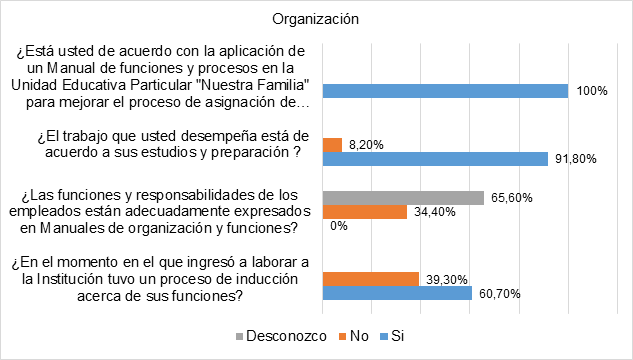 El estudio se ejecutó mediante encuestas realizadas al personal de la institución, se pudo constatar que no existe una organización acorde a las necesidades de cada departamento ya que no se evidencia los procesos y funciones de las actividades de estos.