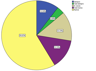 En la figura 3, se puede evidenciar que el 82,76% de los estudiantes sus padres están verifican que envién sus actividades, mientras que el 3,45% de padres no esta pendiente del envío de tareas, por lo tanto se puede inicar que el control del envío de tareas es un factor que ayuda a que el estudiante pueda adquirir responsabilidad y mejorar su desempeño escolar; pero a pesar del control debe despertar su motivación intrínseca por el estudio.