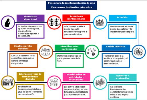 Dentro de las instituciones educativas es útil y necesario que se implemente una CVA encaminada a cubrir necesidades o problemáticas, es decir, su implementación coadyuvará a que dichas necesidades sean abordadas de manera significativa, lo que motivará que los participantes se integren por amplia gama de posibilidades que se puede ofrecer encaminada a cubrir sus intereses, una comunidad en donde se puede aprender interactuando y sin las presiones que la escuela formal esta acostumbrada a emplear, así se desarrolla habilidades sociales y digitales que servirán para afrontar su vida diaria y estar acorde a lo que la sociedad digital espera. Por ello se propone pasos para implementar una CVA, en cada etapa se debe considerar los nudos críticos en el aprendizaje de los estudiantes para que su ejecución tenga por objeto fortalecer las debilidades y potenciar las habilidades.