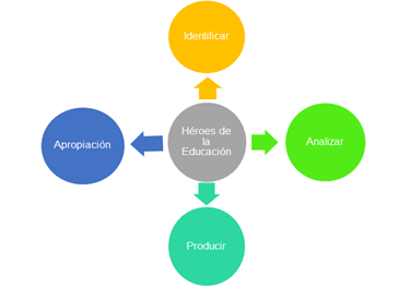 El modelo propuesto “Héroes de la Educación” se efectuó con un enfoque en cuatro aspectos claramente definidos: Identificar, Analizar, Producir y Apropiación con el fin de mejorar la formación docente. (figura1)
