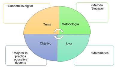 El presente trabajo nace de la practica educativa, siguiendo la línea de investigación e innovación educativa. Se trabajó con una investigación de diseño no experimental, con un paradigma epistemológico cualitativo, en el cual se empleó una entrevista semiestructura mediante un grupo focal por la plataforma de Zoom a docentes de Educación Preparatoria, Elemental y Básica Media, en donde se consideró unidades de análisis, categorías y segmentos, donde se obtuvieron como resultados generales que los docentes tratan de innovar en sus clases sin considerar un modelo en específico y son limitados por el tiempo y la carga de trabajo por documentación. Por todo lo antes mencionado se realizó un cuadernillo digital de actividades para docentes con el método Singapur, enfocado en la enseñanza de la matemática, con el fin de mejorar la práctica educativa docente.