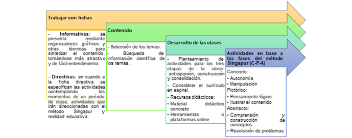El método Singapur centra su éxito en tres fases enlazadas la uno de la otra y en secuencia, partiendo de lo concreto, seguido de lo pictórico y finalizando con lo abstracto, abreviando C - P – A, fomentando la creación de material concreto y la práctica continua para mejorar la comprensión de los conceptos, enriquecimiento del pensamiento lógico y profundización de una matemática creativa e innovadora. Durante el desarrollo del método el docente es un guía que diseña e implementa actividades centradas en situaciones problemáticas contextualizadas para que el estudiante sea quien descubra de forma autónoma el proceso y recursos que debe usar para su resolución y presentación.