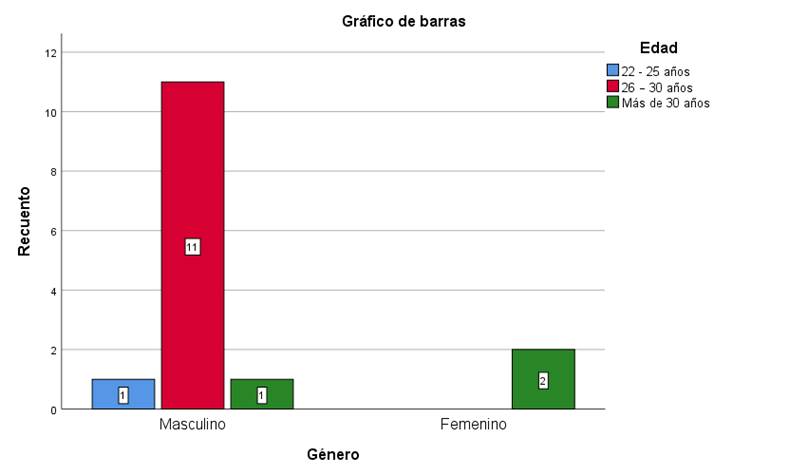 En el gráfico 1. del 100% de encuestados, con respecto al género, en su mayoría con el 86,7% es masculino, mientras que el 13,3% corresponden al género femenino, con relaciona la edad en su mayoría con el 73.3% tiene entre 26 – 30 años, mientras que el 20% posee más de 30 años y finalmente con el 6,7% entre 22 – 25 años.