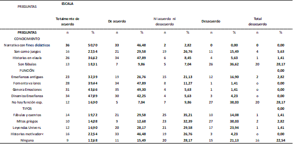 En la Tabla 3, se presentan las respuestas mayormente votadas que se deben resaltar, fueron en cuanto a su función “dinamiza el proceso de enseñanza”, las otras correspondieron a los tipos de narrativas en donde los encuestados acuerdan en que son “historias motivadoras” y son “mitos griegos”.