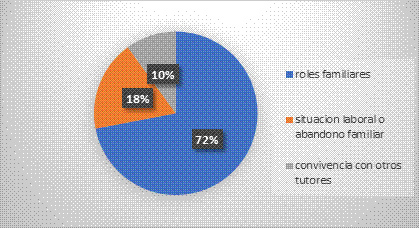 Al momento de determinar los factores condicionantes para el delito, tal como se visualiza en la figura 4, encontramos que en el 72% fue por distorsión de roles familiares por divorcios y/o separaciones, madre o padre fuera del país por situación laboral, abandono de padres biológicos, en el 18% de los casos fue la convivencia con otros adultos no tutores y en el 10% existían datos de baja autoestima que condicionó el hecho.