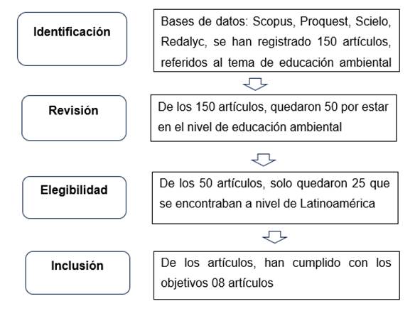 Para la obtención de los artículos científicos utilizados en este estudio se emplearon diferentes fuentes de información a través de la Biblioteca Virtual de la UCV, utilizando Redalyc y bases de datos como ProQuest, Scopus, Scielo. Durante el proceso de búsqueda de información se utilizan diferentes palabras clave como: educación ambiental, cuidado del medio ambiente.