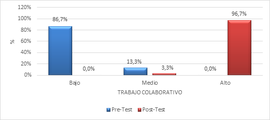En la Tabla 1 y Figura 1, se ve claramente que en el pre-test se obtuvo un porcentaje de 86.7%, donde los educandos alcanzaron un nivel bajo sobre el aprendizaje significativo mientras que el 13.3% logró el nivel medio, después de aplicar el Google for Education (post-test), el 96.7% de los educandos logró el nivel alto sobre el aprendizaje significativo y el 3.3% obtuvo un nivel medio; denotándose la mejora del aprendizaje significativo del pre al pos-test en los educandos de educación superior.