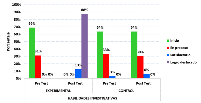 Como respuesta al primer objetivo, se pudo constatar que los estudiantes tuvieron deficiencias preocupantes en relación a sus habilidades investigativas, específicamente, en el área de Ciencia y Tecnología. Para ello, se aplicó un pre-test, en el cual los estudiantes del grupo experimental y control presentaron carencias similares sobre dichas habilidades (69% y 64% en nivel de inicio).