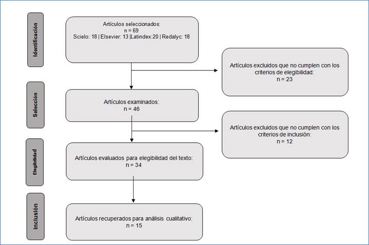 De acuerdo con la figura 1, la investigación se realizó empleando una metodología de revisión sistemática, donde se eligieron estudios que mantenían relación con la problemática y, se tuvo en consideración la información de revistas indexadas de repositorios internacionales, Scielo, Elsevier, Latindex y Redalyc, siguiendo los criterios de inclusión y exclusión: