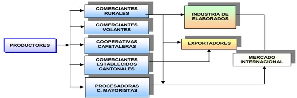 Los efectos del cambio climático y la caída de los precios generan vulnerabilidad a los pequeños productores lo que se traduce en un mayores niveles de pobreza (Alfaro, 2010). Otro problema radica en el ciclo de la cadena productiva del café (Figura 5). Este ciclo de comercialización es generalizable en la producción cafetera en todo Ecuador.