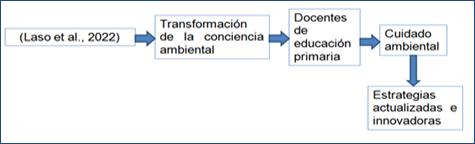 La figura 1 muestra un esquema sintético del trabajo de Laso et al. (2022) sobre la Conciencia ambiental y el cambio climático: Un estudio con docentes de Educación Primaria en formación. Allí, se pudo determinar una transformación de la conciencia ambiental en los docentes de educación primaria, lo cual constituye un aspecto positivo, por cuanto serán ellos los portadores de la información necesaria para inculcar a sus estudiantes el cuidado ambiental mediante la aplicación de estrategias actualizadas e innovadoras.