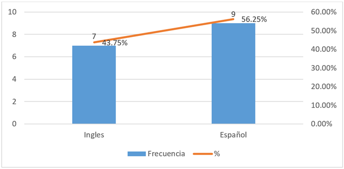 Como se aprecia en la figura 3, el idioma que se precisó como preeminente en la revisión, fue el español con un porcentaje de 56,25% sobre el inglés, el cual obtuvo un 43, 75%.