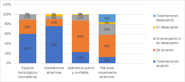 En la dimensión de elementos tangibles (Figura 5), las instalaciones físicas del hotel y su tecnología destacan como fortalezas, con un 90% y 89% de respuestas positivas, respectivamente. La apariencia pulcra y confiable del personal también es bien valorada (87% positivas). Sin embargo, los elementos visuales asociados al servicio, como afiches o murales, muestran debilidades significativas, con un 39% entre neutrales y negativas, lo que sugiere que la presentación de materiales podría mejorarse para reforzar la percepción de calidad tangible.