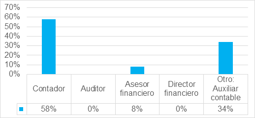 Cargo que desempeña en la institución que labora: al preguntar a los encuestados sobre el cargo que desempeñan en la institución que laboran, la mayoría de los encuestados en PYMES de Loja son contadores (58%), lo que destaca la importancia de las funciones contables y financieras en estas empresas. Un 33% ocupa cargos clasificados como “Otro”, indicando roles diversos, mientras que solo un 8% es asesor financiero. No se reportaron auditores ni directores financieros, lo que podría señalar una estructura organizativa más simple y menos especializada (Figura 1).