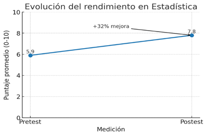 En términos prácticos este resultado reflejó un incremento aproximado del 32 % en el nivel de comprensión cuantitativa al pasar de un promedio de 5.9/10 en el pretest a 7.8/10 en el postest. Igualmente, los estudiantes no solo aprobaron en mayor proporción, sino que también demostraron una mejor capacidad para interpretar tablas, gráficos y datos aplicados a casos comunicacionales. La figura 1 muestra la evolución en el desempeño de los estudiantes en Estadística como resultado de la intervención metodológica.