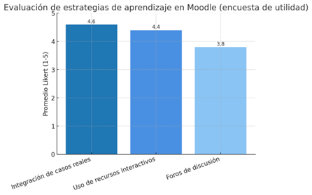 Según los resultados de la encuesta de percepción, las estrategias más útiles para el aprendizaje fueron la integración de casos reales y el uso de recursos interactivos. Sin embargo, los foros de discusión obtuvieron menor valoración, lo que sugiere rediseñar o dinamizar estas actividades para aumentar su efectividad.