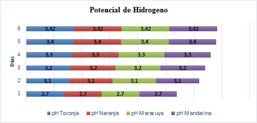 Las muestras evaluadas mostraron una variación en la evolución del grado alcohólico, específicamente en el tercer y cuarto día en los casos del vino de Toronja y Naranja y mantuvieron su balance en los casos de Mandarina y Maracuyá. Sin embargo, el grado alcohólico al final es menor en los dos primeros casos (Vino de Toronja y Naranja).
