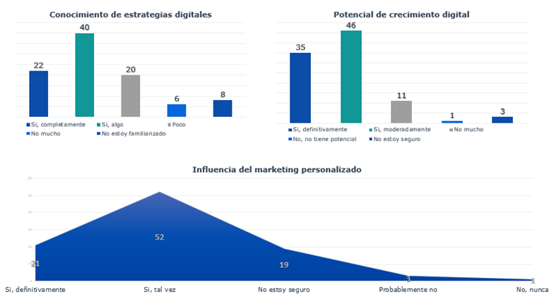 Las diferencias emergen principalmente en la dimensión organizacional y en la ejecución del marketing mix. Un análisis en Montería, Colombia, caracteriza debilidades en el sistema promocional, brechas en competencias del talento humano y una aplicación limitada del marketing mix en producto y plaza, junto con la necesidad de fortalecer posventa, precio y promoción. Estas condiciones matizan el potencial del canal digital cuando no existe una estructura institucional que soporte la segmentación, la personalización y la medición, lo que contrasta con la percepción mayoritaria de crecimiento y con la disposición a pagar identificadas en la muestra propia. De esta comparación se infiere que la eficacia del marketing digital depende tanto de la calidad de las actividades en redes como de las capacidades organizacionales para implementarlas de manera integral y sostenida en el tiempo (Nuñez et al., 2022).