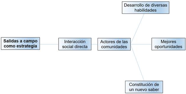 Las salidas a campo como estrategia, según la figura 2, garantizan la interacción social con los diferentes actores de las comunidades visitadas, convirtiéndolas así en oportunidades para el desarrollo de diversas habilidades, destrezas y competencias; de igual modo, estas conducen a un nuevo saber, el cual fortalece la red conceptual y los nuevos procesos neuronales de cada individuo en su interacción con el entorno (Rico et al., 2025; Isea et al., 2025).