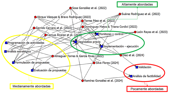 El procedimiento propuesto para el diseño de PDL constituye un aporte significativo al superar una de las principales brechas identificadas en la literatura: la concentración de esfuerzos metodológicos en las fases iniciales del ciclo de vida, como el diagnóstico previo, en detrimento de una orientación integral que abarque desde la concepción hasta la planificación detallada de recursos y la evaluación de factibilidad. En consonancia con los hallazgos del análisis de redes, que evidenciaron una baja frecuencia de fases como la “validación” y el “análisis de factibilidad” en los estudios revisados (Abreus Vázquez & Bravo Rodríguez, 2023; Camue Álvarez et al., 2025), el procedimiento presentado estructura cinco etapas que integran estas aristas desde el diseño y permite una articulación coherente con las exigencias del Decreto Ley 33 de 2021 (Consejo de Ministros de la República de Cuba, 2021), al incorporar los requerimientos diferenciados de las modalidades de PDL (socioculturales, ambientales, institucionales, de I+D+i y económicas-productivas).