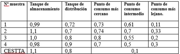 Las calibraciones del sistema se procedieron a la toma de muestras de concentración de cloro las cuales se calibro acorde a la norma INEN 1108, valores de 1,1 mg/l en la casa de máquinas o garita de clorado, 0,8 mg/l en el tanque de distribución y de 0,7 a 0,3 mg/l en la red de distribución según los análisis que se realizaron en CESTTA