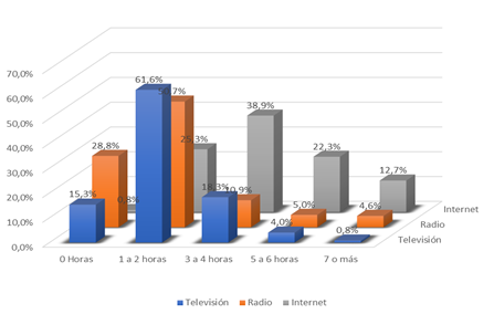 Figura 2. Análisis comparativo del tiempo dedicado a: Televisión, Radio e internet. Fuente: Elaboración propia