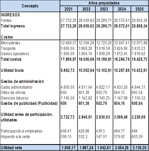 Se estableció un estado de resultados proyectado a 5 años, con un crecimiento de la demanda del 10%, con un incremento en los costos y gastos de una inflación de 0,023%, Se presenta en la figura 10.