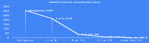 Sobre la generación de empleo se puede apreciar que 53.6%, es decir 306 de los 571 encuestados no genera ninguna fuente de trabajo, en tanto que 37.9% 216 interrogados emplea de 1 a 5 personas. 38 emprendimientos que representan 6,7% ha contratado de 6 a 10 individuos, 9 emprendimientos, que corresponde a 1.5% genera de 11 a 15 empleos, y tan solo 0.3% esto es 2 de los 571 sondeados emplea a más de 15 personas.