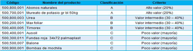 Componente 3: clasificación de productos (ABC): las mercaderías deben ser inscritas de acuerdo con sus características y especificaciones, se tomará en cuenta el sistema ABC, los artículos e insumos de mayor valor son: A, se debe tener un mayor control a fin de evitar pérdidas, B serán aquellos artículos de categoría intermedia y C, aquellos que requieren escasa inversión. Este tipo de registro permitirá a su vez ordenar y verificar de manera física los productos e insumos obtenidos por la empresa (ver figura 3).